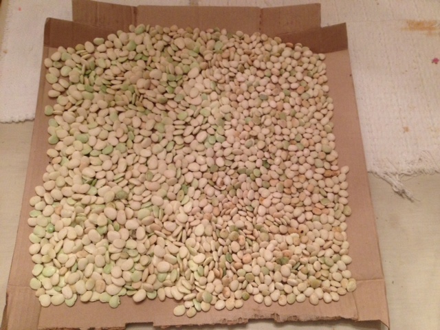 this brings us to current time. Mid to late Autumn. A few days ago I went to the garden and pulled the last of the Lima beans. The frost had gotten them so I needed to get the beans off the plants and throw the plants in the compost. I ended up with about a half of a bushel of bean pods. Yesterday I spent a good part of the morning opening the pods and getting the beans out so they can air dry. As I sat there in the edge of the porch, the chickens mulled around my feet waiting for me to throw them the smaller beans or the ones with "bad spots". After I finished getting them from the pods, I spread them out on cardboard to let air dry.